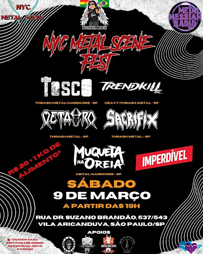 09/03 - Instituto Cultural Bolívia Rock (portas abertas às 20h) Rua Dr. Suzano Brandão, 537/543 - Vila Aricanduva, São Paulo/SP, 03502-000 Tosco (Thrash Metal/Hardcore - SP) (22h00 - 23h00) Trendkill Inc. (Heavy/Thrash Metal - SP) (23h00 - 00h00) Metauro (Thrash Metal - SP) (00h00 - 01h00) Sacrifix (Old School Thrash Metal - SP) (01h00 - 02h00) Matthew Szablewicz + Sacrifix (Slayer set) (02h00 - 02h30) Muqueta na Oreia (Metal/Hardcore - SP) (02h30 - 03h30) O Programa NYC Metal Scene, na Metal Messiah Radio, sempre primou por apresentar ao mundo o melhor do Rock e Metal mundial para seus ouvintes, com lançamentos, clássicos, novas bandas e entrevistas na programação. O programa vai ao ar todas as terças-feiras, das 19h às 21h (EUA) e das 20h às 22h no Brasil, totalmente GRÁTIS, sem comerciais, sem a necessidade de aplicativos, sem vendas inconvenientes e sem pop-ups. Em outras palavras, oferece apenas conteúdo recheado de muita música boa, entrevistas ao vivo, chat online e completa interação entre todos. Independentemente do seu fuso horário, a Metal Messiah Radio está sempre pronta para trazer o melhor do Rock e Metal para te acompanhar a qualquer momento do seu dia! Apoiadores: Metal Na Lata (www.metalnalata.com.br | @metalnalata) Um Metal Por Dia (@ummetalpordia) JZ Press (@jzpressassessoria) Cordas de Aço Rock Clube Lokas Moto Clube (Divisão Leste) (@lokasmc) Representação no Brasil: Vagner Ferreira Assessoria de Imprensa e Divulgação: JZ Press | Metal Na Lata Divulgação: Elizabeth Queiroz (Tibet) Colaboração: Márcio Miranda (Shampoo), China Lee, Dalam Jr., Gigi Jardim Som ambiente: DJ Guidão Agradecimentos à Cátia Bolívia Cristina (Instituto Cultura Bolívia Rock) e Bruna Frazão (Hellraiser Rock Bar)